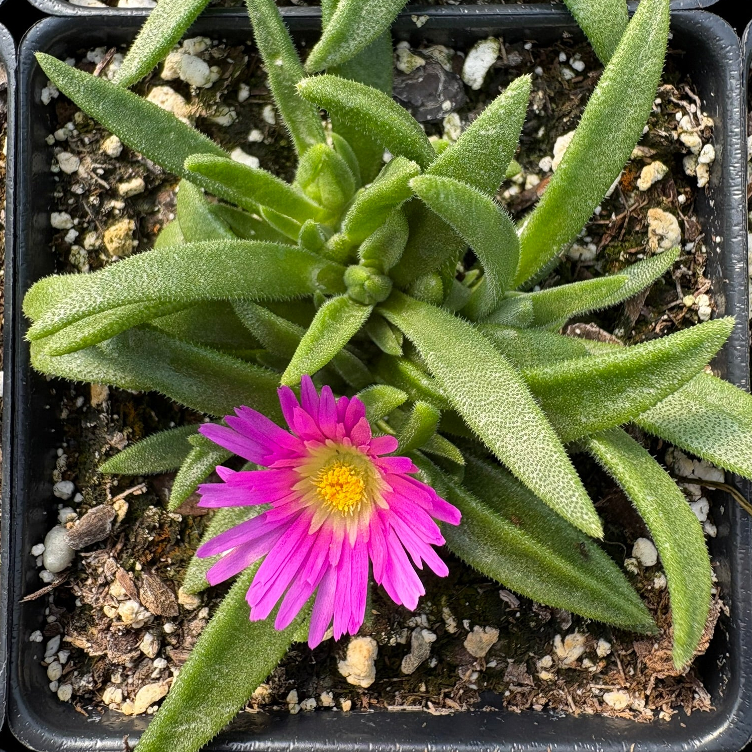 Low growing South African native with pointed dark green succulent foliage. In the summer large purple daisy-like blooms with yellow centers cover the groundcover foliage. Requires excellent drainage, making it perfect for the rock garden.