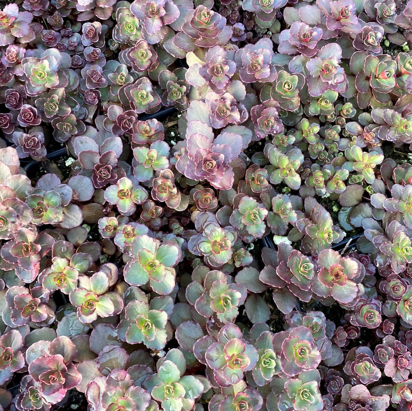 Groundcover sedum with rich deep burgundy red leaves on red stems. Rosy red flowers. Height 4-6".