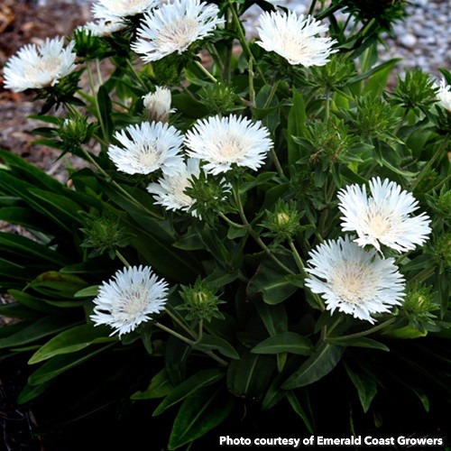 Large white cornflower-like blooms emerge creamy yellow and mature to bright white. Compact, mounded deep green broad foliage. Height 12-24".